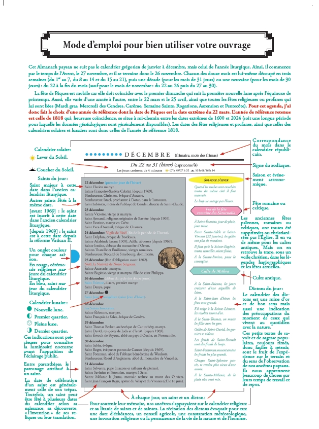Parce que l’Almanach était bien souvent le seul livre que possédaient nos ancêtres ruraux, cet ouvrage est conçu comme un Almanach, avec ses calendriers solaire et lunaire, ses invocations religieuses, sa kyrielle de saints protecteurs, ses pèlerinages, ses conseils agricoles, ses foires et ses dictons de sagesse populaire... mais il est bien plus qu’un Almanach ! Il est surtout un livre d’Histoire qui se veut le témoignage d’un passé oublié... Celui d’une France rurale perdue, avec son rythme régulier de festivités et de travaux agricoles saisonniers, ses gestes du quotidien, ses traditions, ses croyances, ses superstitions, ses usages anciens et ses vieilles pratiques ancestrales.